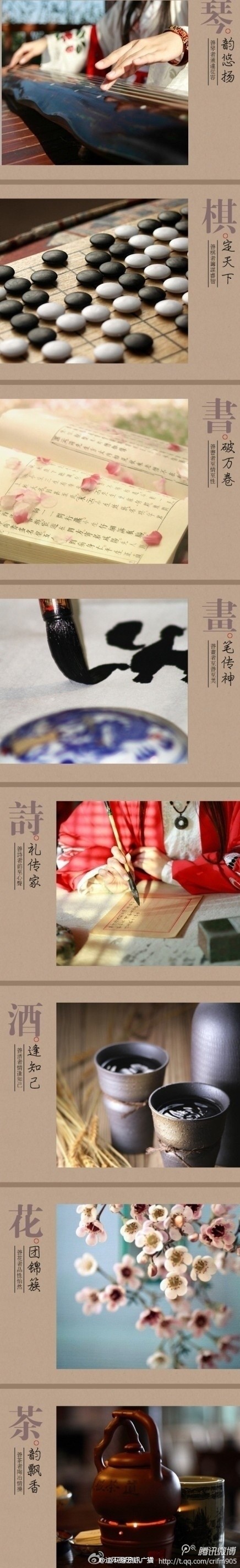 【中国古代八大雅事】琴、棋、书、画、诗、酒、花、茶。善琴者通达从容,善棋者筹谋睿智,善书者至情至性,善画者至善至美,善诗者韵至心声,善酒者情逢知己,善花者品性怡然,善茶者陶冶情操。你现在擅长几大雅事?